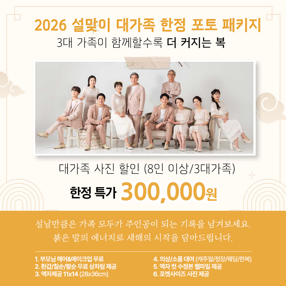 가족사진은 촬영부터 사진선택까지 여유있게 1시간 소요됩니다. (대가족사진은 시간이 더 걸립니다.)